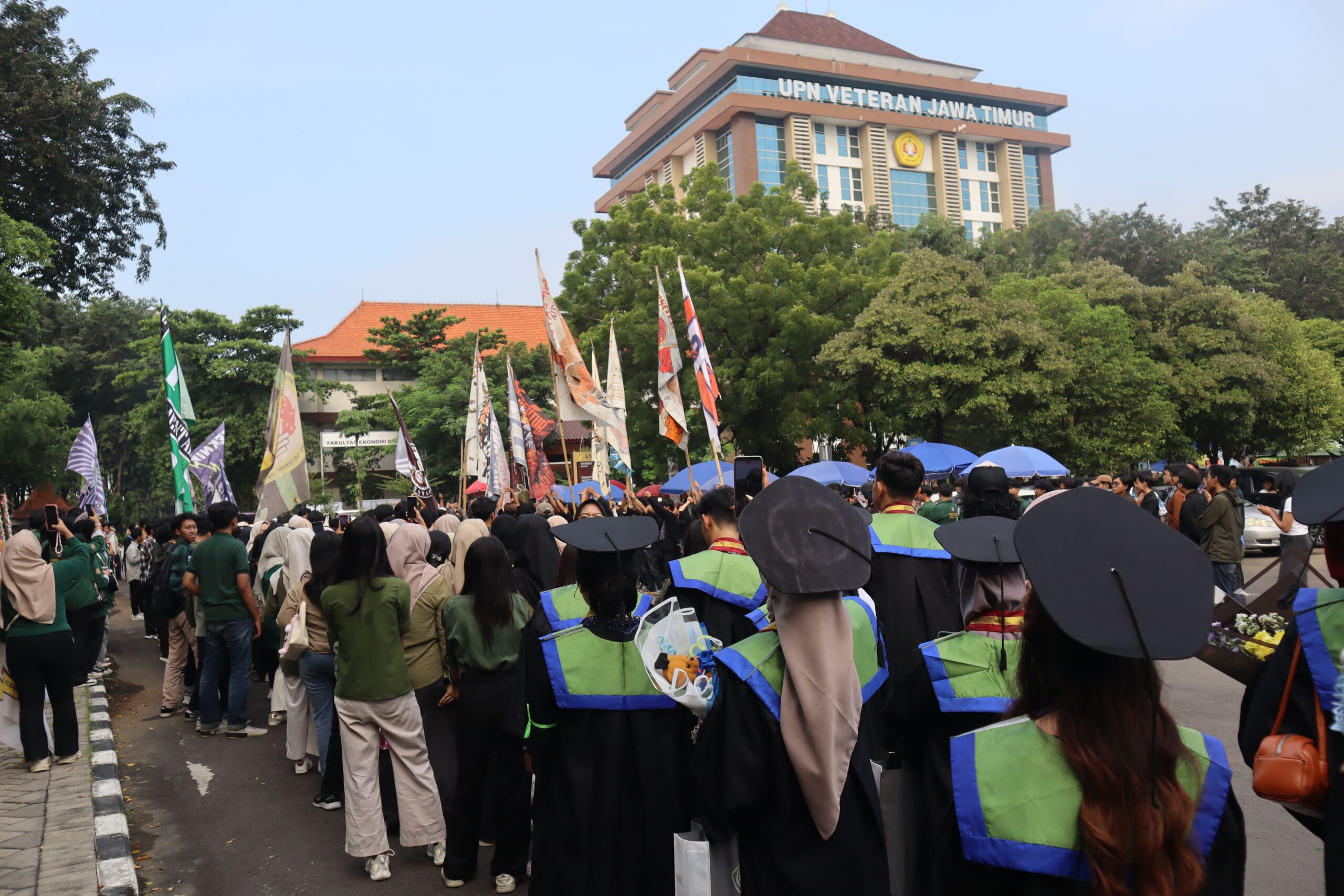 Sabtu, 26 April 2025 — Belakang Research Center, UPN “Veteran” Jawa Timur. Arak-arakan periode April kembali hadir sebagai salah satu tradisi paling berharga di lingkungan Teknik Lingkungan. Mengusung tema “Udrata”, yang berasal dari Udaya (terbit), Parama (yang baru), dan Utkata (ketinggian), makna ini dirangkai menjadi filosofi “melambung ke ketinggian yang baru”—sebuah gambaran perjalanan wisudawan dalam menapaki fase kehidupan selanjutnya. Nuansa arak-arakan kali ini dikemas dengan konsep “terbang”, mengadaptasi elemen visual balon udara, warna pastel hangat, serta atmosfer lembut ala film Up dan lanskap Cappadocia. Suguhan ini menghadirkan kesan optimis, ringan, dan penuh harapan bagi para wisudawan yang tengah menapaki babak baru.
