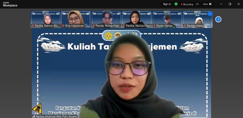 On August 7, 2025, the Research and Technology Department held an online guest lecture on Occupational Health and Safety (OHS) Management via Zoom, with the theme “Strengthening Human Resource Capacity in Applying OHS Management Systems to Handle Workplace Health and Safety Hazards.”The event was targeted at students from the 2022, 2023, and 2024 cohorts, and was organized by students from the 2023 and 2024 classes. The agenda included an opening session, welcoming remarks, presentations by two professional speakers, a Q&A session, a summary, and a closing.Through this event, students were expected to better understand how OHS principles are applied in industrial and mining sectors, start building professional networks, and prepare themselves for the working world with strong safety competencies.